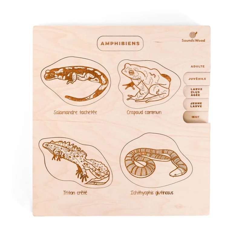 Puzzle éducatif en bois pour explorer le cycle de vie fascinant des amphibiens, de l'œuf à la métamorphose adulte.