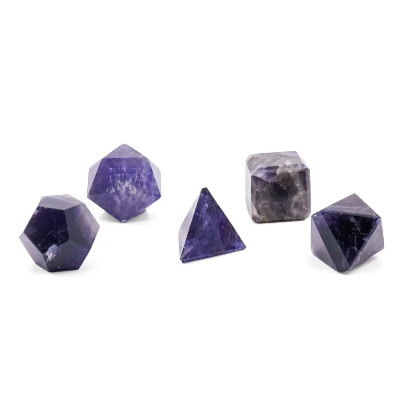 Ce lot de 5 solides de Platon en améthyste met à l’honneur les grandes formes géométriques classiques : tétraèdrehexaèdreoctaèdredodécaèdre et icosaèdre. Dans l’histoire des idées comme dans certains univers liés à la géométrie sacrée, ces volumes fascinent par leur équilibre, leur régularité et la sensation d’ordre qu’ils inspirent au regard.