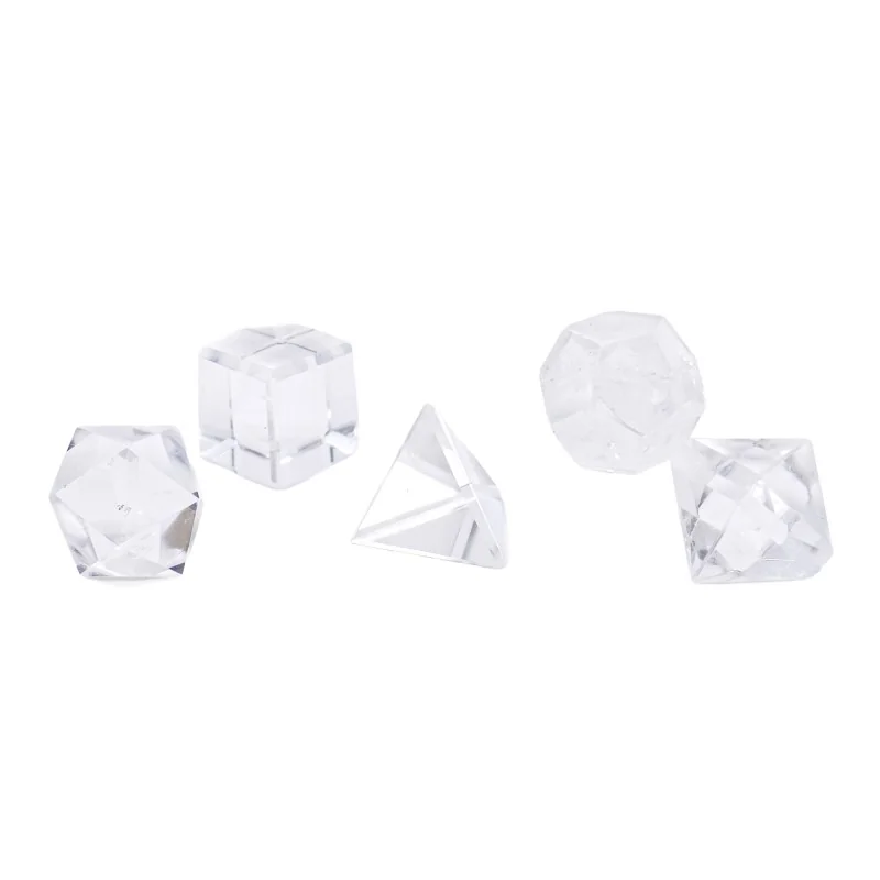 Un lot de 5 solides de Platon en cristal de roche, apprécié pour sa transparence lumineuse et sa géométrie inspirante.