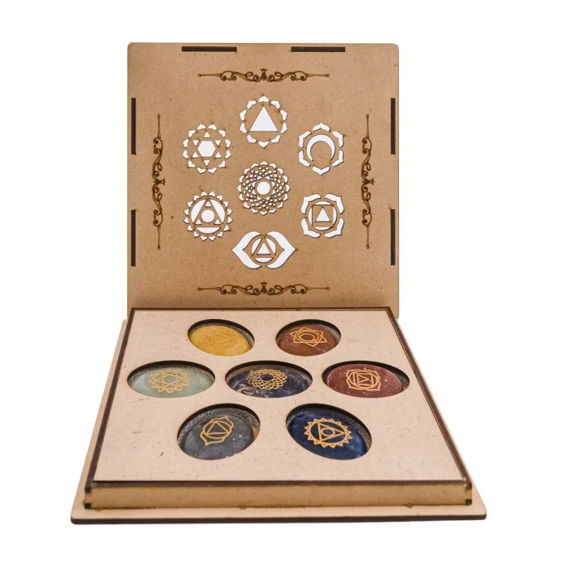 Un coffret en bois fait main avec 7 galets sérigraphiés, pensé pour accompagner vos instants de méditation et vos univers symboliques autour des chakras.