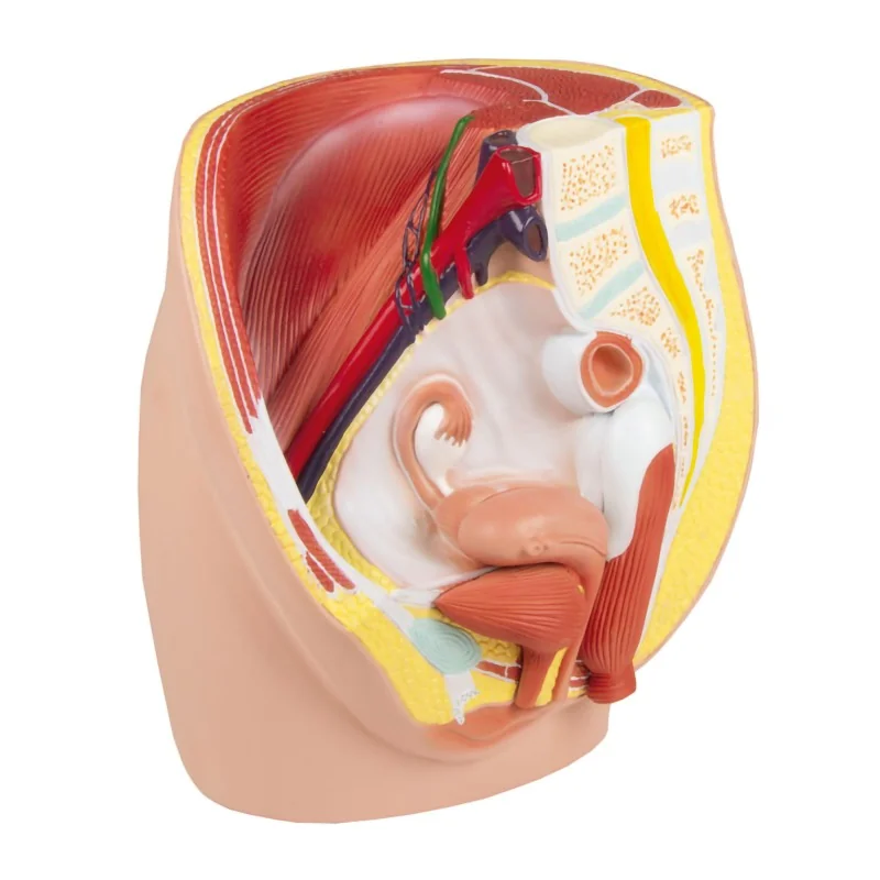 Ce modèle représente un bassin féminin taille naturelle en section médiane sagittale, subdivisé en trois pièces qui permettent d’observer les parties internes. Outre les muscles et les vaisseaux abdominaux, il montre particulièrement les organes urogénitaux. Sont amovibles une moitié de l’utérus, du vagin et de la vessie, ainsi qu’une moitié de l’intestin avec le rectum. Dimensions : environ 22 × 20 × 25 cm, poids approximatif : 1 kg.