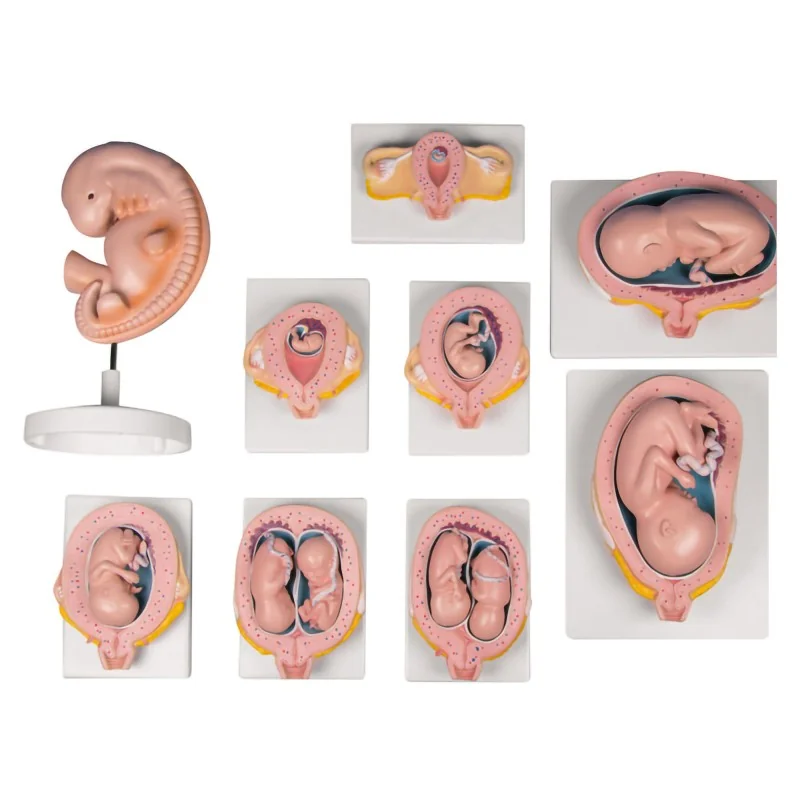 Ensemble pédagogique composé de 9 modèles de grossesse à échelle réelle, développé en collaboration avec une école de sages-femmes allemande. Il illustre le développement humain du 4ᵉ au 24ᵉ semaine et comprend 8 modèles grandeur nature ainsi qu’un modèle agrandi. Les principaux composants anatomiques de l’utérus et de l’embryon/fœtus sont fidèlement représentés et expliqués dans la notice. Chaque modèle est monté sur un support amovible, certains permettant de détacher le fœtus pour une observation plus détaillée.
