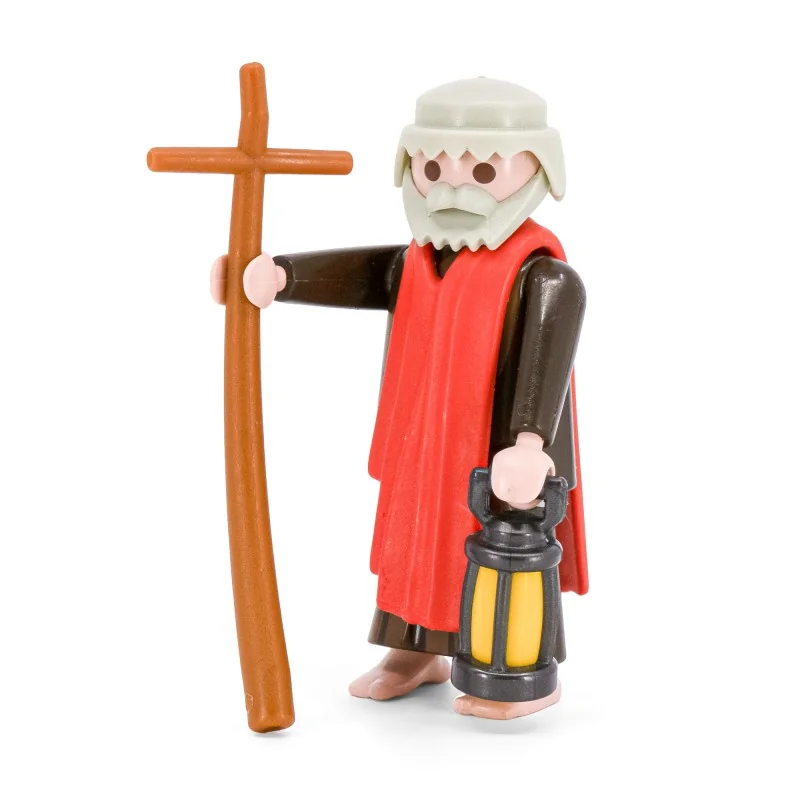 Ce pèlerin Playmobil porte une tunique brune, un manteau rouge et un bâton en forme de croix ; sa lanterne éclaire sa route dans vos histoires.