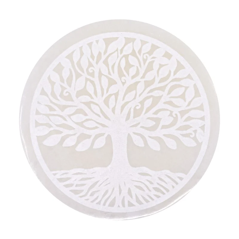 Cette plaque en sélénite gravée de l’Arbre de Vie séduit par son éclat lunaire et sa texture naturellement fibreuse. La sélénite diffuse une lumière douce et satinée, créant une atmosphère apaisante, propice au calme, à l’ancrage et au recentrage intérieur.
