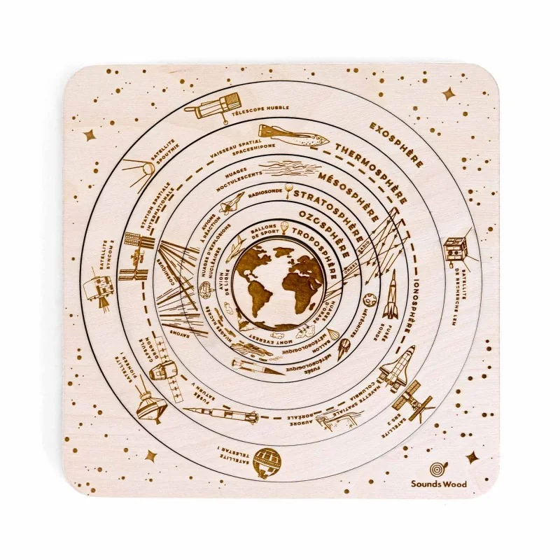 Ce puzzle pédagogique en bois permet de visualiser et de manipuler les strates de l'atmosphère manière tactile et créative.