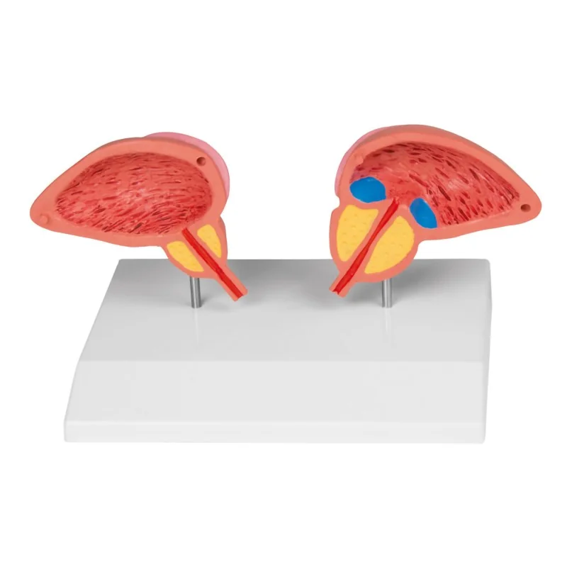 Ce modèle anatomique présente une prostate fractionnée en deux moitiés montée sur un support amovible. L’une des moitiés montre une prostate sainement normale avec vessie, tandis que l’autre révèle une hypertrophie bénigne de la prostate (HBP) provoquant un rétrécissement de l’urètre et une urine résiduelle. Le modèle mesure environ 20 × 9 × 13 cm, ce qui le rend facile à exposer ou à transporter dans un cadre pédagogique ou clinique.