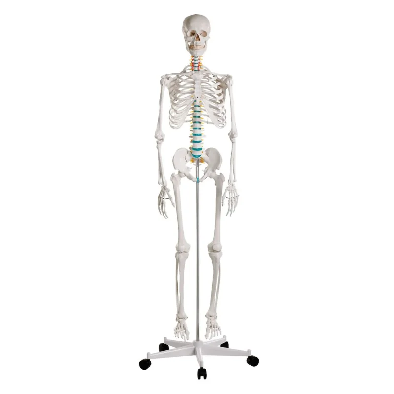 Le modèle “Oscar” est une reproduction de squelette adulte masculin grandeur nature composée d’environ 200 os. Il est conçu pour une mobilité réaliste grâce à des articulations flexibles aux épaules, hanches et genoux, des membres détachables très rapidement, et une mâchoire avec dents construites séparément. La colonne vertébrale montre les nerfs spinaux, l’artère vertébrale et une protrusion discale dorsolatérale, ce qui en fait un outil pédagogique complet. Il est monté sur un support à roulettes (5 branches) robuste, détachable, et d’une hauteur totale avec support d’environ 178 cm, pour un poids d’environ 9 kg.