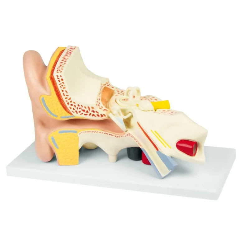 Ce modèle anatomique de l’oreille externe, moyenne et interne est agrandi à 3× la taille réelle. Il présente quatre parties détachables : le tympan avec les osselets (malleus, incus, stapes), la cochlée et le labyrinthe vestibulaire avec les nerfs cochléaire et vestibulaire, dont une moitié de la cochlée peut être retirée pour examiner l’intérieur. Monté sur un socle stable, ce modèle pèse environ 1 kg et mesure ≈ 36 × 16 × 20 cm.